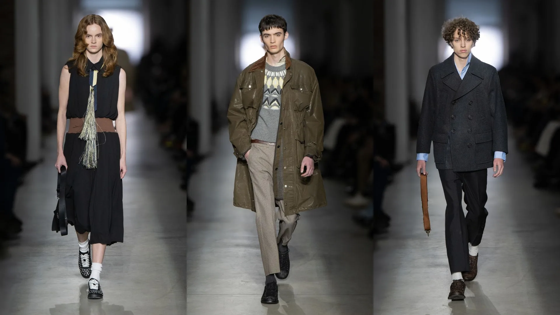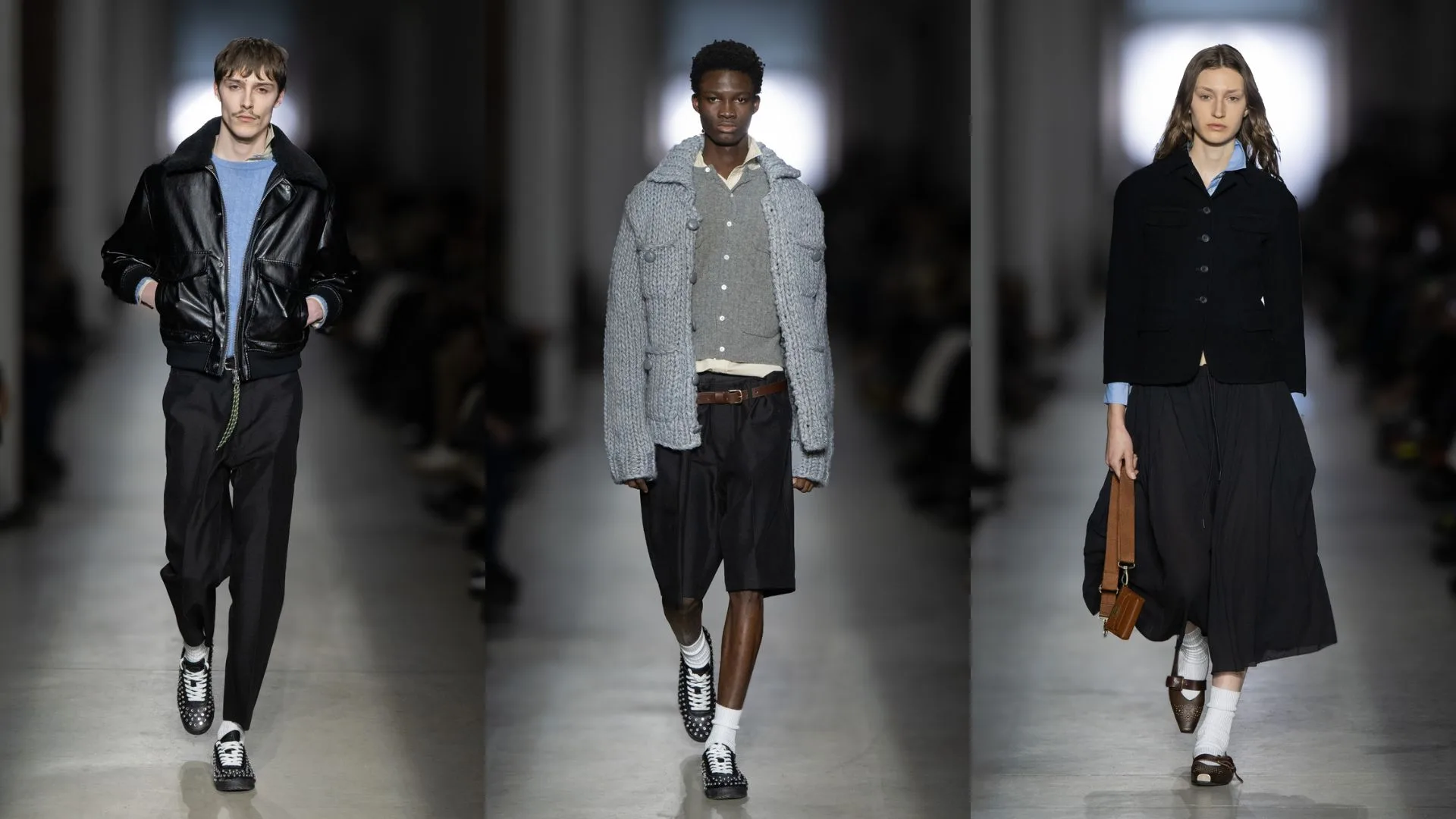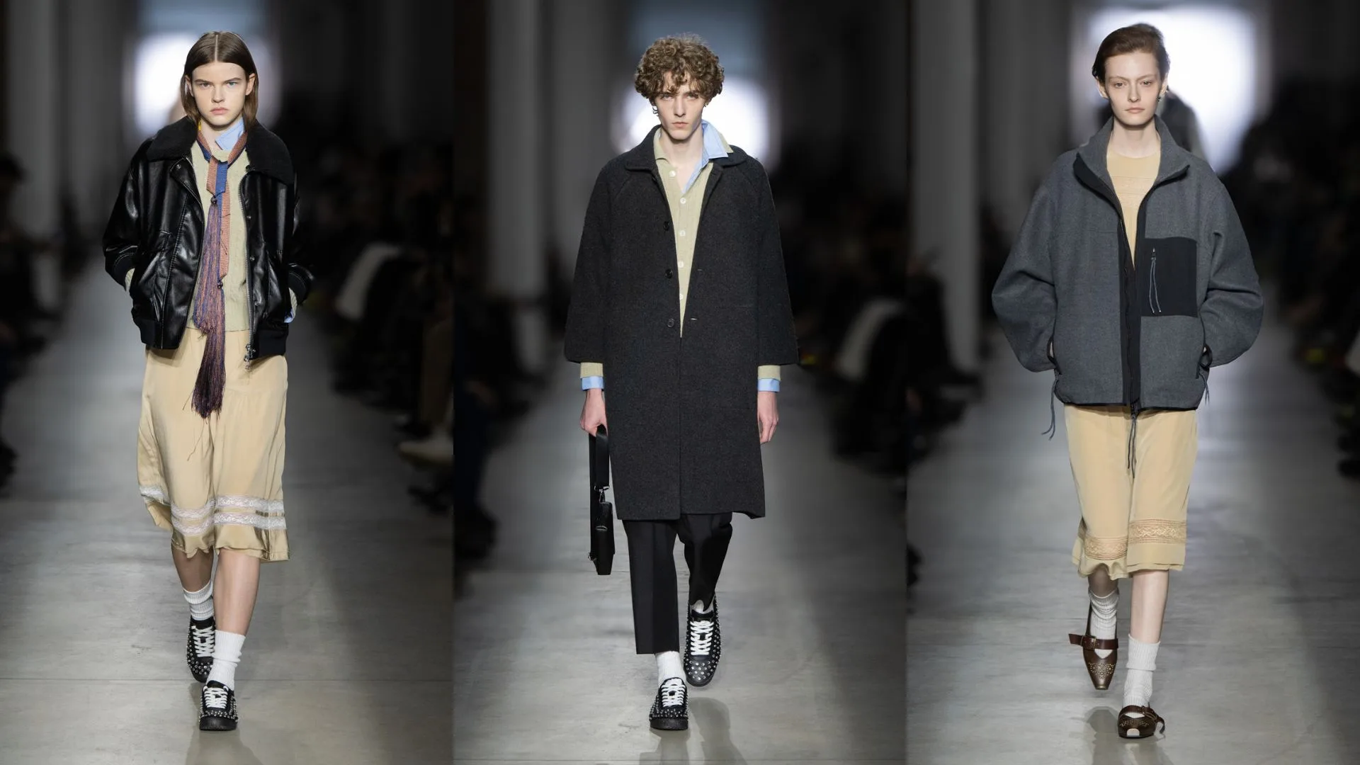 Tiny tailored pea coats, suits and jackets in soft wool double face or in micro houndstooth, gorpcore-inspired zip-up mid-layer jackets in double-face, oversized cardigans and micro twin sets in cable-knit wool are for unisex, giving space for personal style to ultimately define the look.