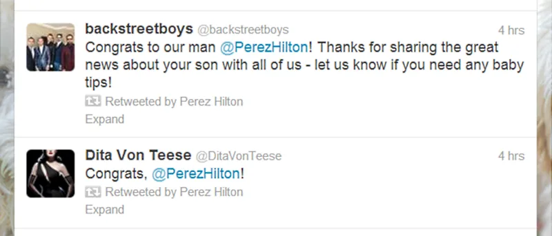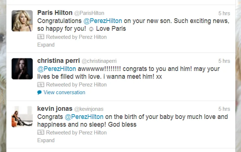 He went on to thank his readers (something he hardly does), sounding all mature and dare we say, very un-Perez-like. Still, it surprised most of his readers and even some celebrities as they took to Twitter to congratulate him. Including the likes of Paris Hilton, Kevin Jonas, Michelle Trachtenberg, Christina Perri, Carson Daly, etc.
