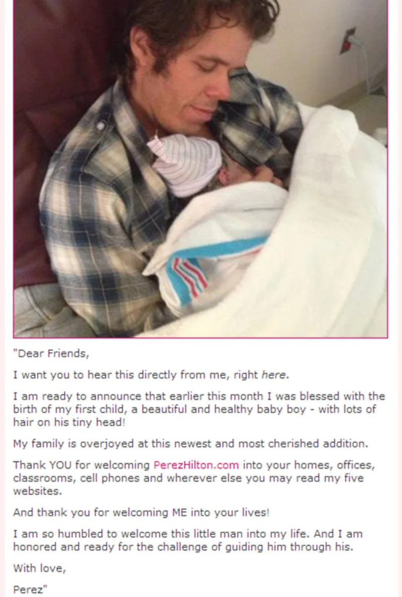 Earlier today, the owner of the celebrity gossip blog made a surprise announcement that he has become a proud father to a baby boy! Yup. Perez even accompanied the news with a picture of himself cradling the baby lovingly: