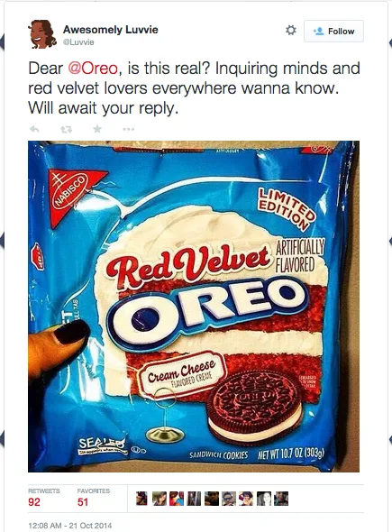 In October 2014, the Twitter cookie community went into overdrive when a tweet surfaced suggesting that a new limited edition flavour of the world-famous Oreo cookies might be released. The original tweet was posted on 18th October but it has since been deleted. After which, a second tweet (directed at Oreo) followed, from a different user, which made a lot of people go, “Okay shite just got real. Is it real?”