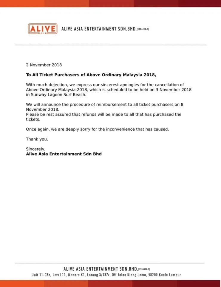Alive Asia Entertainment has announced that the refund process will start from 8th November onwards.