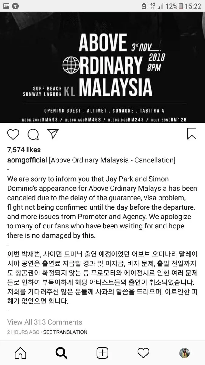 “We are sorry to inform you that Jay Park and Simon Dominic’s appearance for Above Ordinary Malaysia has been cancelled due to the delay of the guarantee, visa problem, flight not being confirmed before the departure until the day before the departure, and more issues from Promoter and Agency. We apologise to many of our fans who have been waiting for and hope there is no damaged by this.”