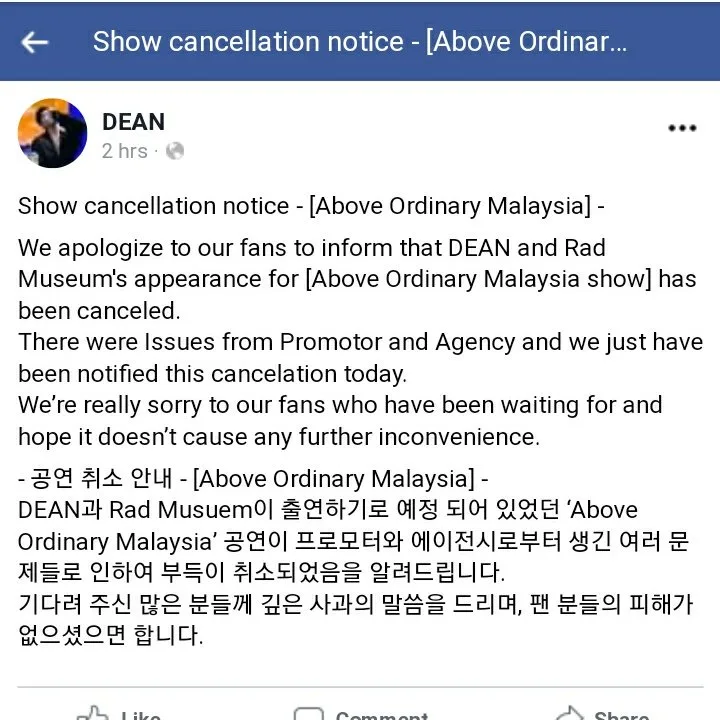 One of our readers just confirmed that the statement was indeed provided by AOMG’s official page. A rep for Dean and Rad Museum also issued a statement on the cancellation of Above Ordinary Malaysia, pointing the finger at the promoter and agency.