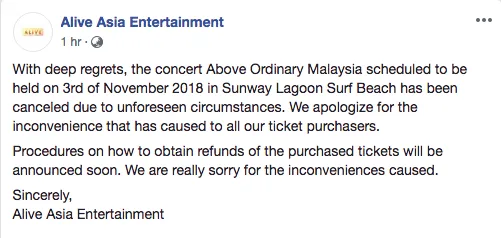 No explanation was given other than the fact that Alive Asia Entertainment “deep regrets” the outcome that was “due to unforeseen circumstances”. To all you K-pop fans who lined up to purchase concert tickets, an announcement for the refund procedure will soon follow.