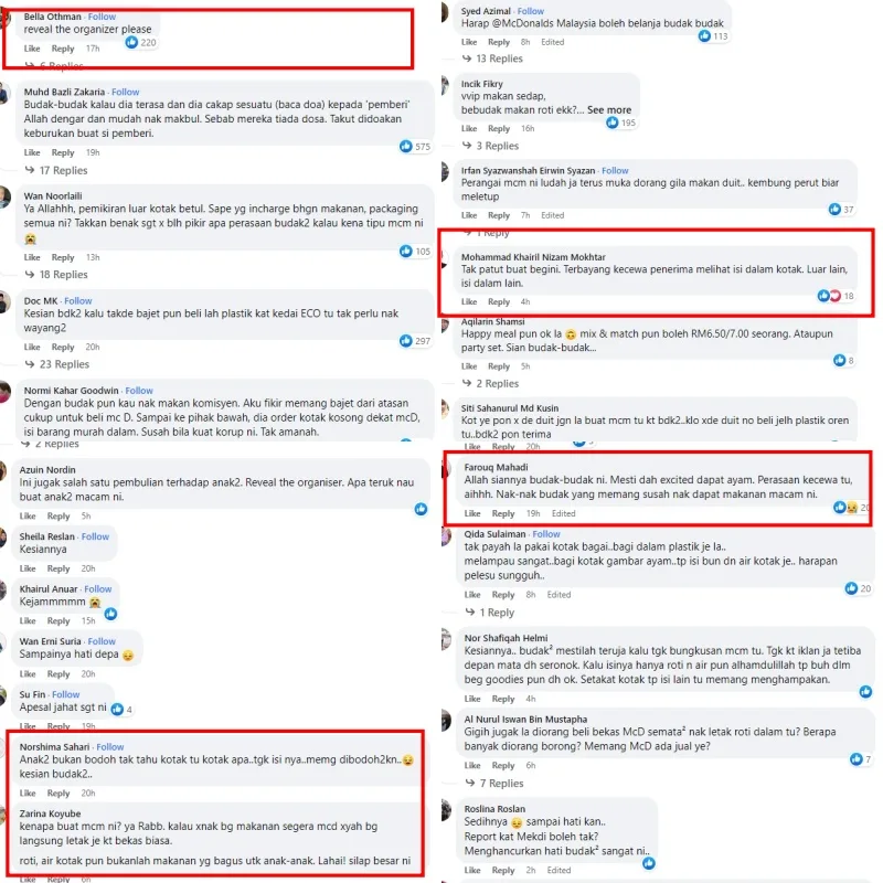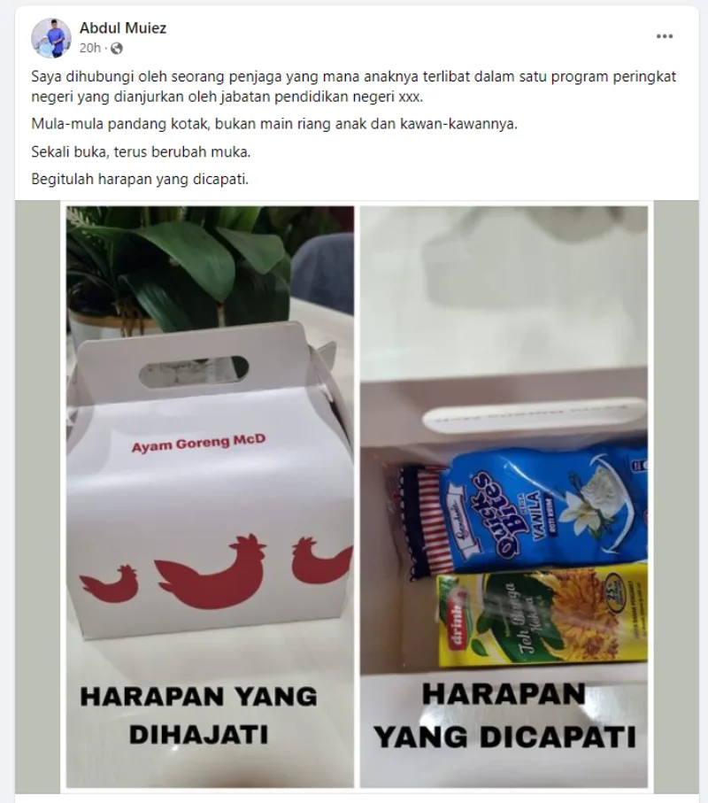 The professional educator shared that the child was extremely excited when the organiser gave the children McDonald’s boxes with the words “McD Fried Chicken” written on them, as any child would be. However, their dreams of having a delicious meal that day were ruined after discovering the boxes did not actually contain fried chicken in them; only a piece of bread and a juice box.
