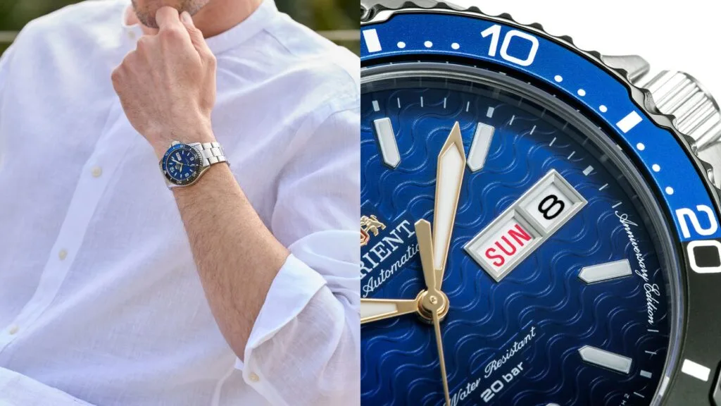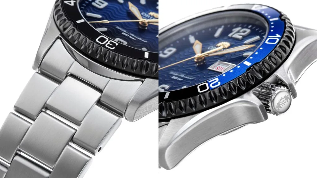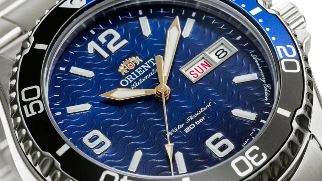 A distinctive characteristic of the limited-edition 20th anniversary model is the blue dial. The dial features Arabic numerals, a design signature of Orient Mako models since its launch in 2004. The blue gradation from 12 o’clock to 6 o’clock represents the beautiful ocean that surrounds Japan, while the dial’s stamped wave pattern, coupled with the words “Anniversary Edition” at 4 o’clock and spectacular gold-coloured hands, highlight the celebratory feel of the 20th anniversary model.