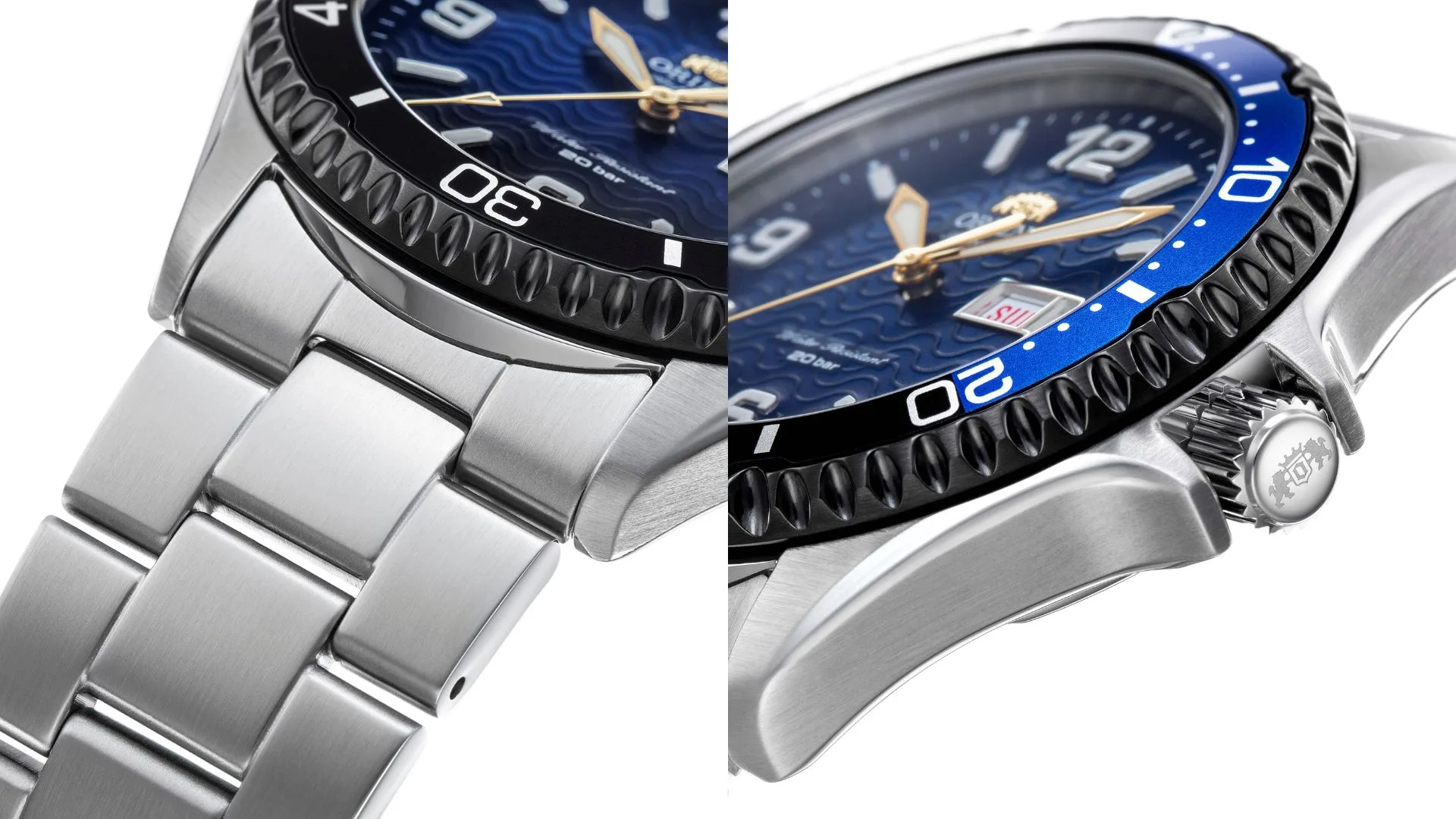 The uni-directional rotating bezel with six grooves, common to all Orient Mako models, is coupled with a two-toned blue and black aluminium plate, with the colours separating at the triangular and 20-minute markers.