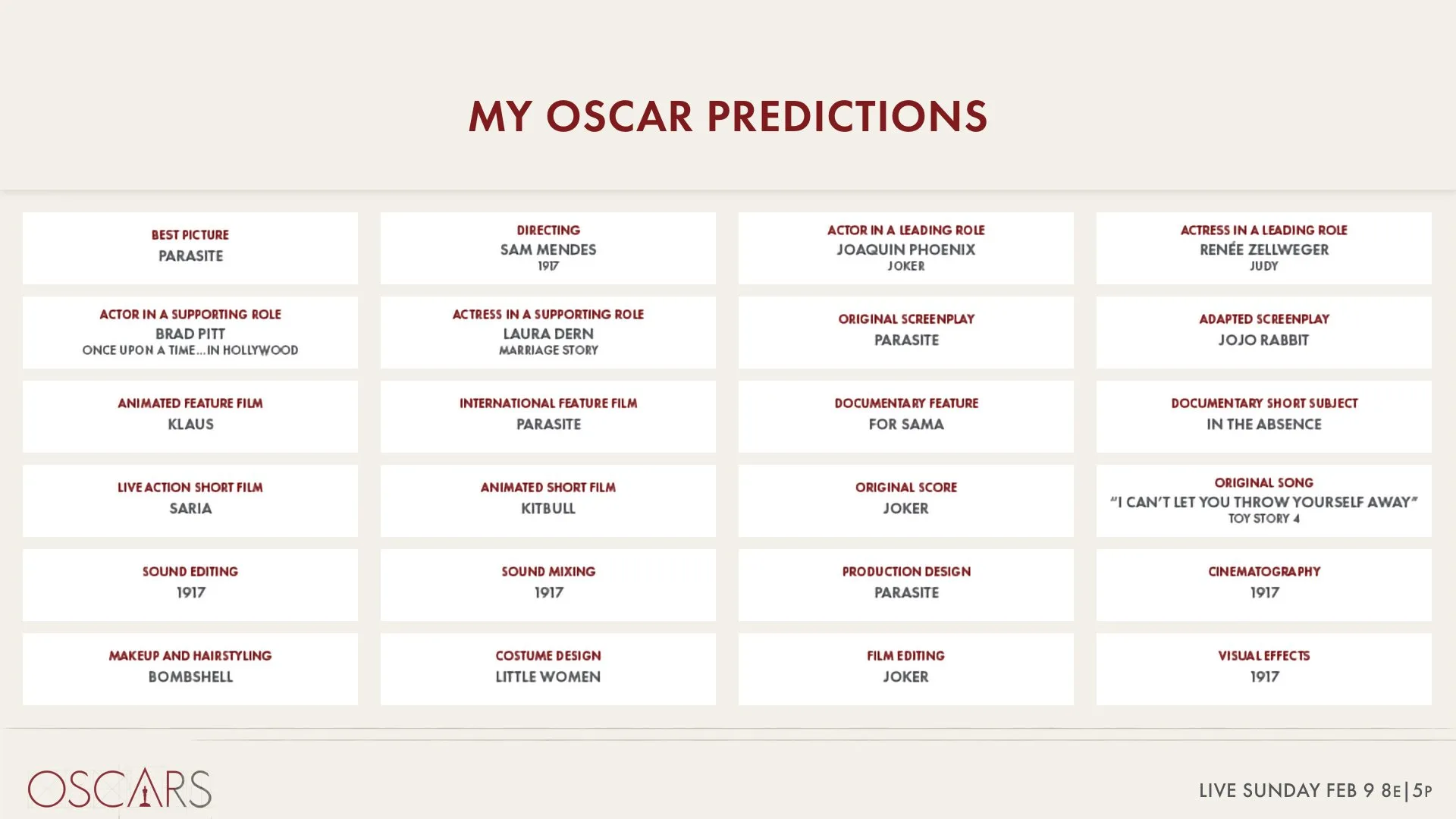 If you’ve been following the award season, a good number of categories are predictable. Unless an upset were to take place, Joaquin Phoenix, Renne Zellweger, Brad Pitt and Laura Dern are said to be shoe-ins for the acting categories.