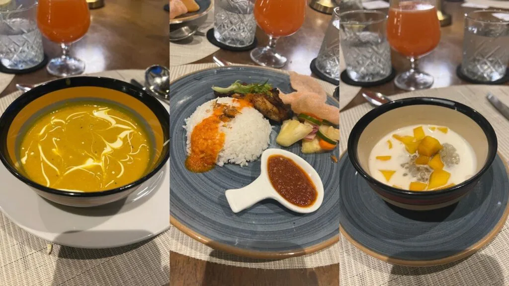 For an extra special dinner on our last night, we switched things up with an intimate 5-course menu, under the Langkawi star-strewn skies. Unfortunately for us, there weren’t any stars that night because of the rainy season. The good thing is, we got to enjoy a good meal. We started off with the Mushroom Egg Crepe and Prawn Mango Tartare on Cucumber. Simple ingredients, but the taste was 5-star. Then we had carrot soup with bread. The soup was mushy and had original flavours. The bread was the best part – it was so crunchy, but when dipped in the soup, it became super soft. Then we had Salmon Niçoise. A French classic salad served with grilled salmon, potato, quail egg, olives and green beans. For mains, Grilled Barramundi with Seafood Tomato Stew. We loved the tomato stew, as it has so much flavour and tanginess. And to wash it down, we had Chocolate Brownie with Italian Gelato and Fresh Berries. Warm, fudgy and sweet!