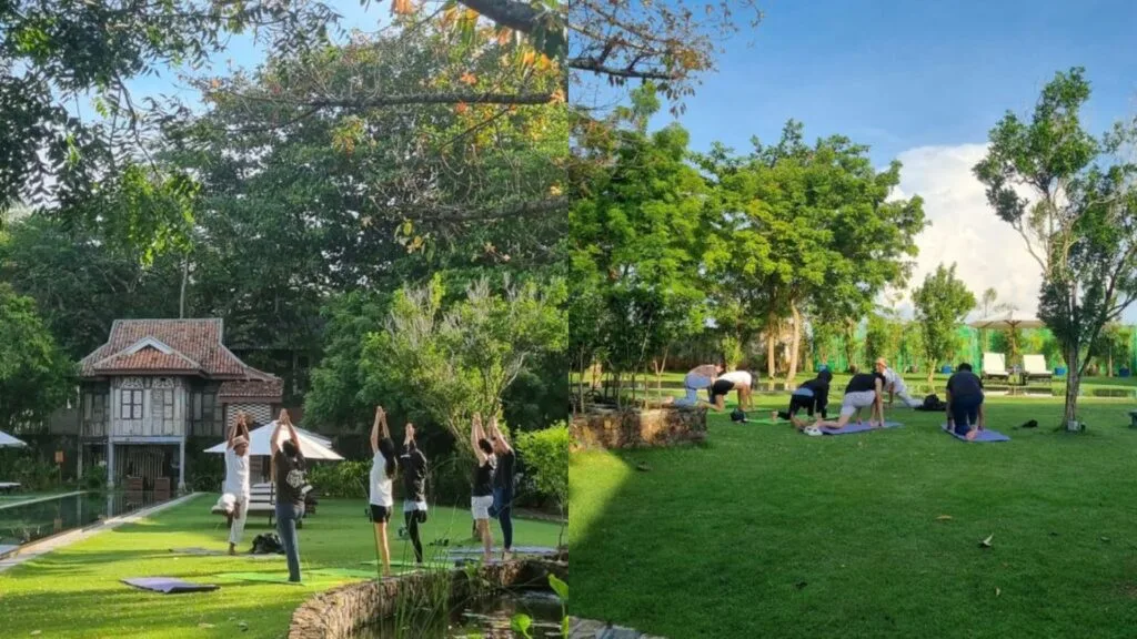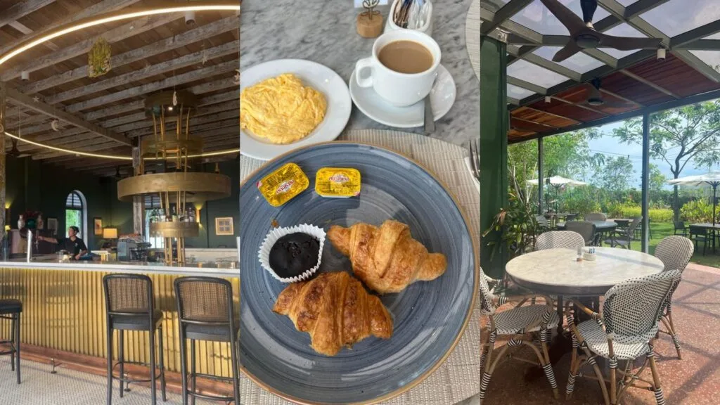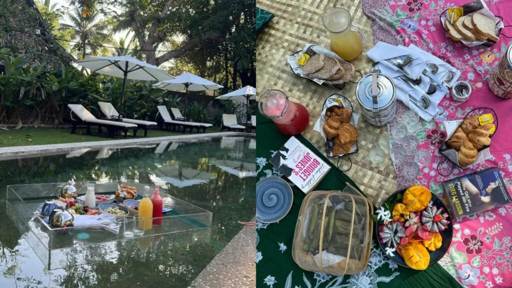 Although we took some time to sleep, we woke up early, at 8am, to join in a calming yoga session at the resort. There was a yoga instructor who guided us through the session. After that, we headed for breakfast. This was the cutest and most Instagrammable breakfast, because we got to experience both Bali and Bridgerton vibes at the same time. One of our media friends stayed in the Straits House, so we decided to do breakfast there since they have ample space and a private pool. We got the “Santai & Swim” Breakfast set, where we indulged in a sumptuous spread of Malaysian and international breakfast favourites, picnic-style, and in the pool.