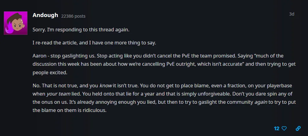Players have spent dozen times more money on OW2 than OW and then you have audacity making excuses about not adding PvE in. How about using all the extra resources you were entrusted in good will to hire more devs and actually delivering on your promises for change?