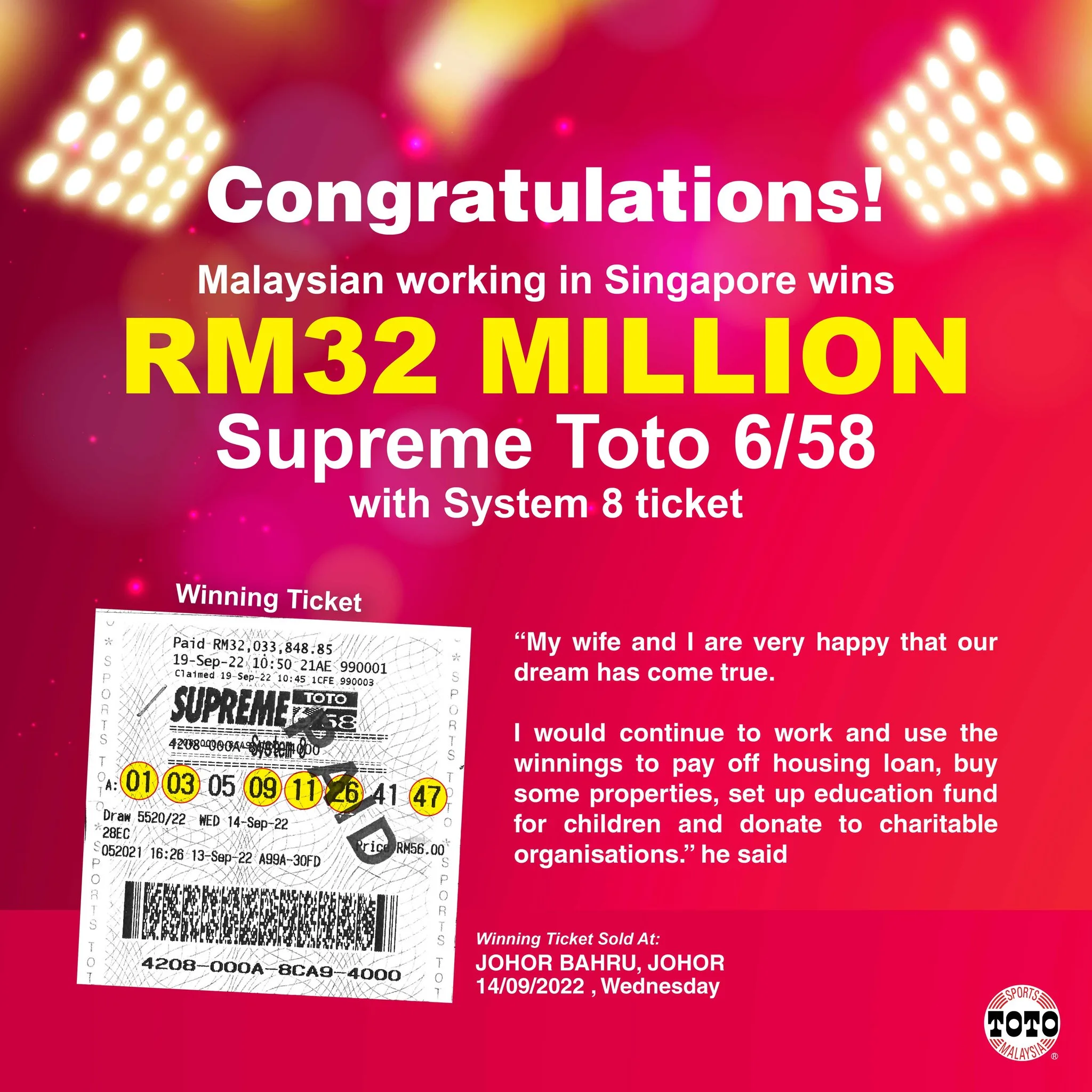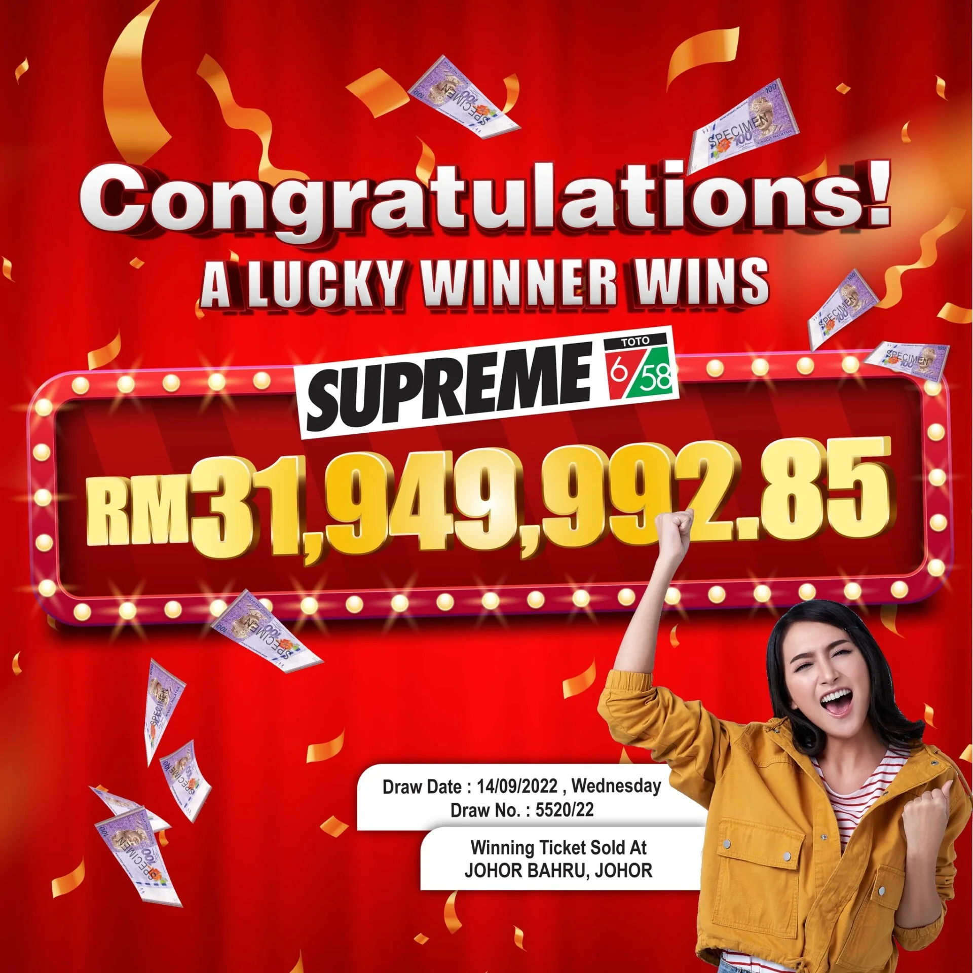 A 44-year-old man from Johor was announced the Grand Prize winner for the Sports Toto Supreme Toto 6/58 jackpot last week (Thursday, 15th September). The man won a total amount of RM31.9 million, making him one of the luckiest and wealthiest winners in Malaysian history. It was reported that the man bought his winning ticket at Bukit Indah Garden, Johor Bahru the day before he was announced the winner.