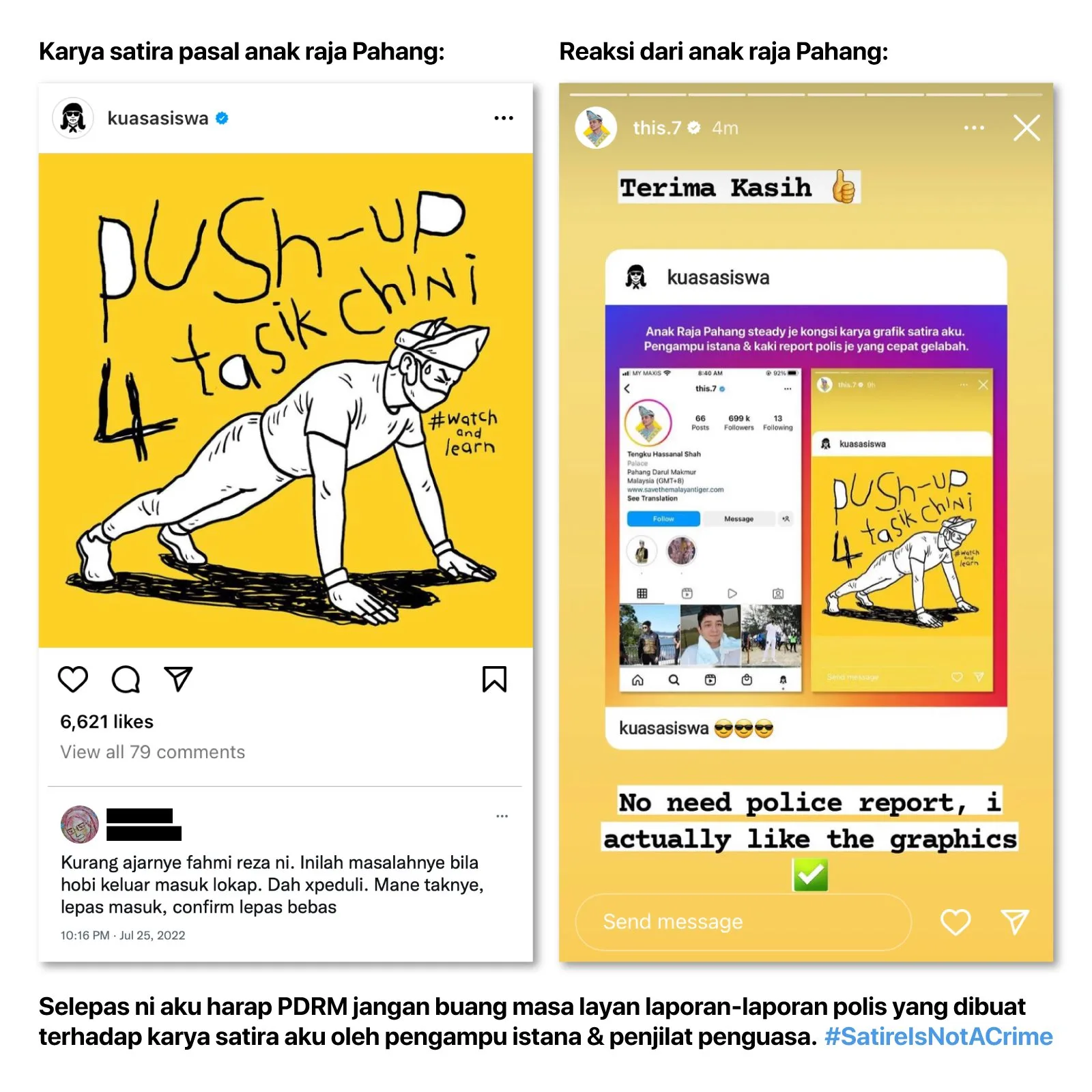 Surprisingly, Fahmi’s satirical artwork has also caught the attention of the Crown Prince himself! He responded by thanking the artist for the artwork. He also wrote, “No need police report, I actually like the graphics. ✅” The latter also took to his Twitter to share the reaction left by the Pahang royalty.