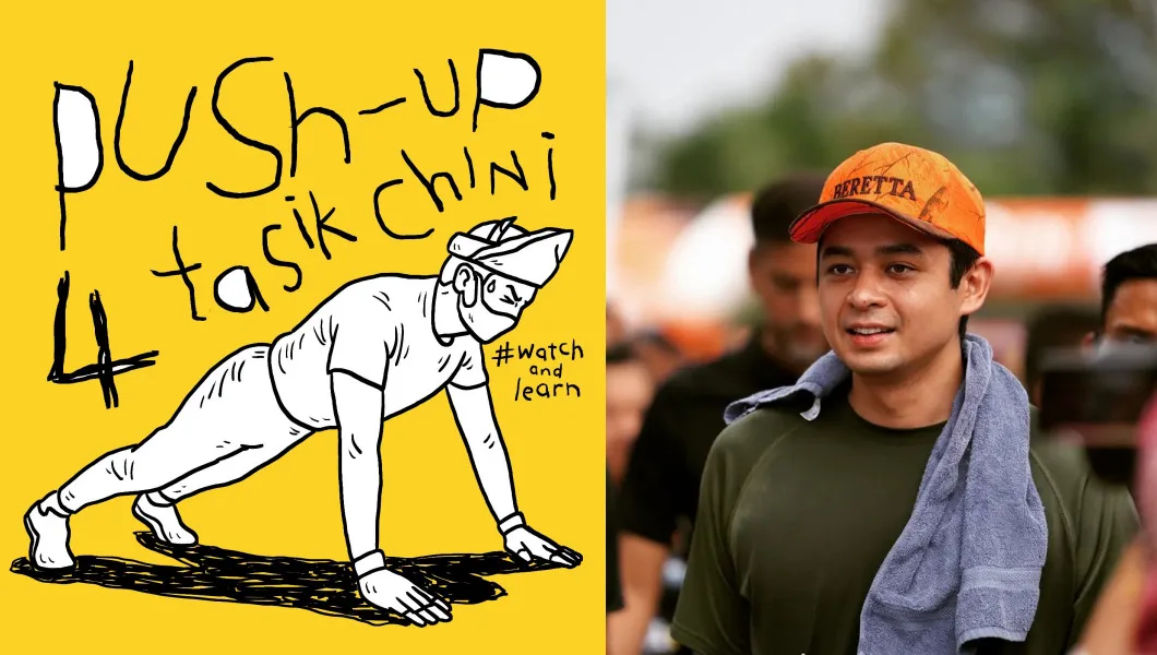 Fahmi Reza is back in the headlines, ladies and gentlemen! The local artist came up with another satirical post on his socials recently. In his latest work, a drawing of a young man wearing the tengkolok (traditional Malay headgear) could be seen doing push-ups against a yellow backdrop.