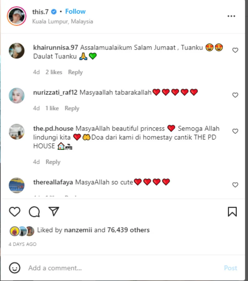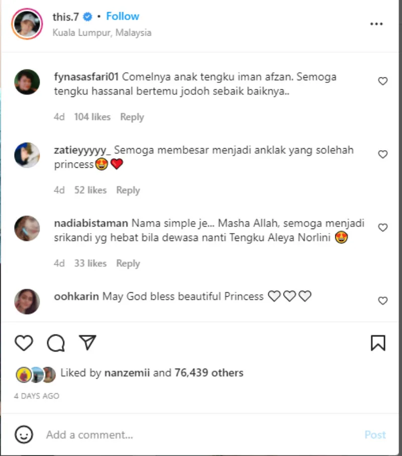 Netizens commented on the photo to celebrate with the royal couple and gushing over the adorable newborn. Many commented congratulating the royal couple for the birth of their second child but one of the comments stood out the most and it was actually left by Her Masjesty Tunku Azizah who is Tengku Hassanal’s mother, had jokingly asked Tengku Hassanal to quickly get married.