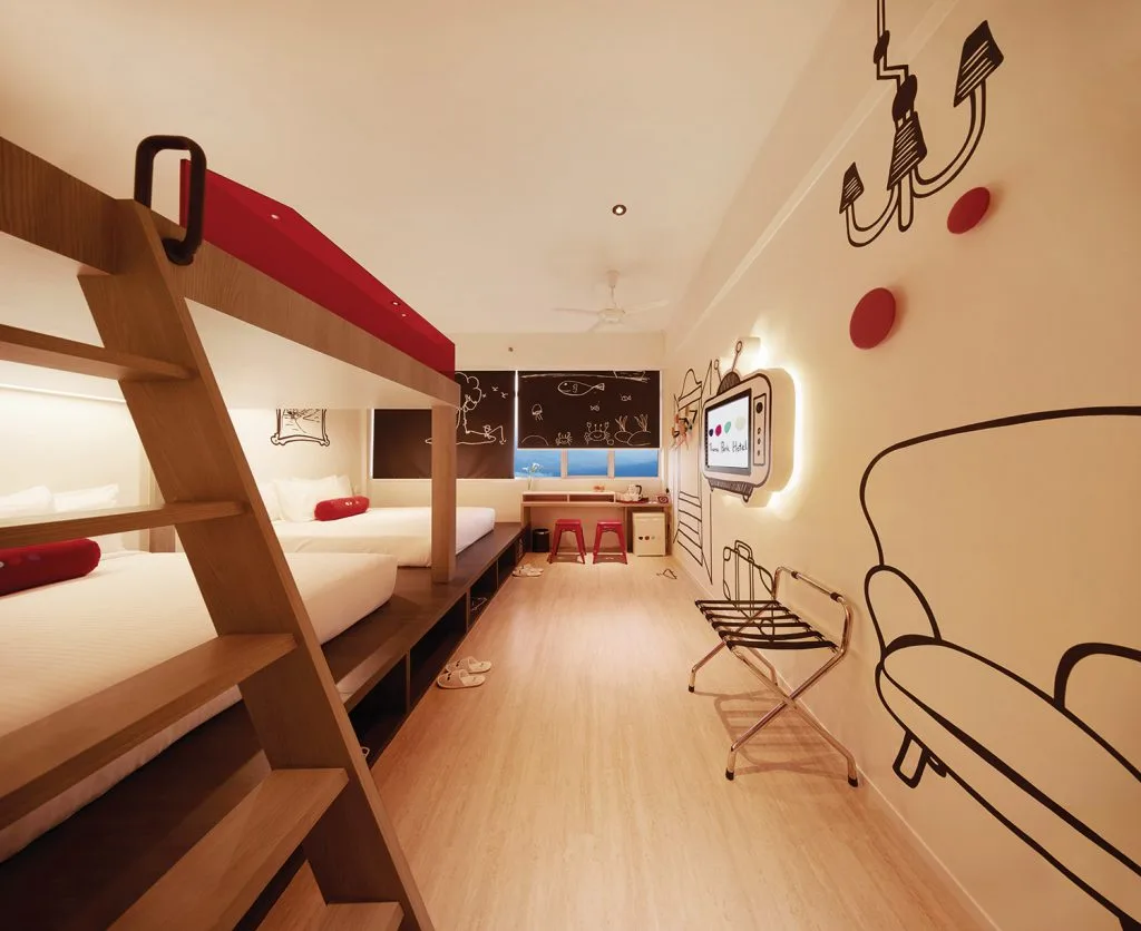 Welcome to the Sixers Room. Formerly known as Hotel on the Park (or Highlands Hotel), the re-opened Theme Park Hotel is situated next to the upcoming Twentieth Century Fox World theme park. There are currently 195 units available and this boutique hotel is divided into a smoking and non-smoking floor. Each Sixers features 3 Queen-sized beds in a 300 sq ft space, and can accommodate 6 people or more.