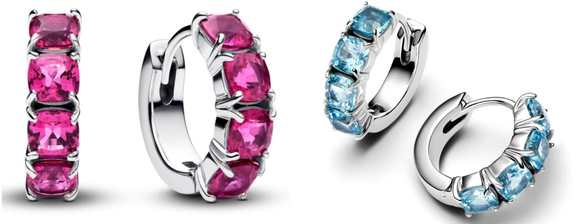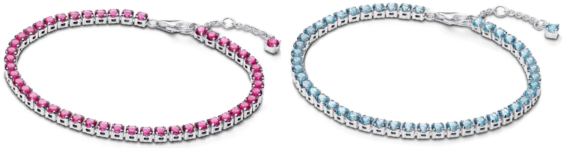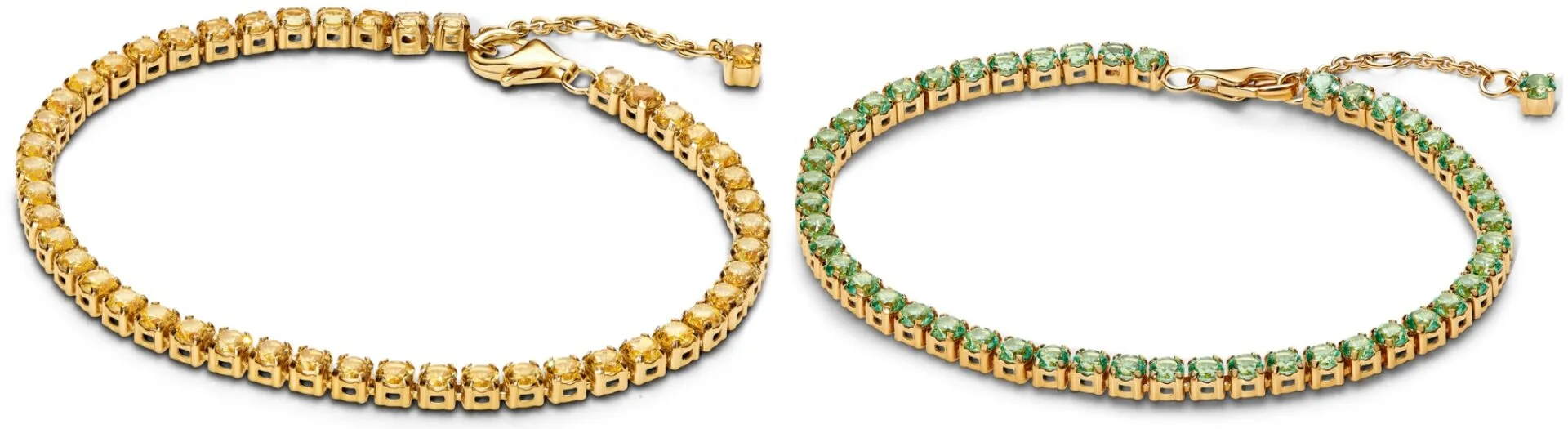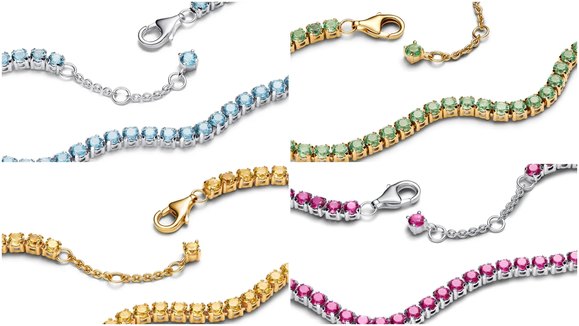 The Sparkling Tennis Bracelets and matching Hoop and Huggie Earrings shine in vivid shades of yellow, green, light blue and phlox pink — each radiating pure joy and playful elegance.