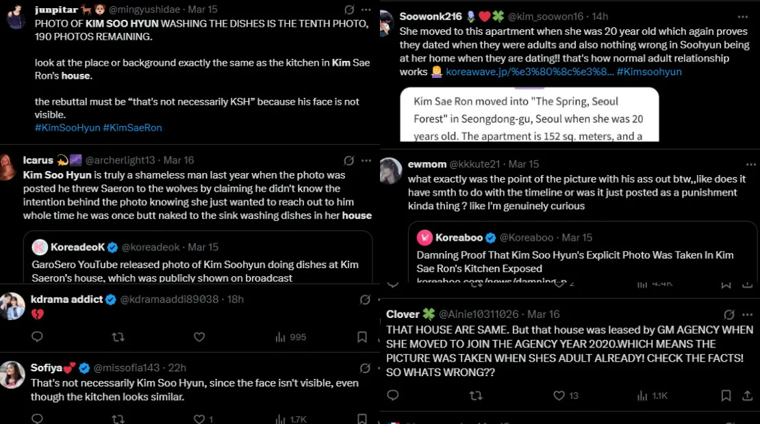Although there is no direct evidence confirming that the person in the photos is Kim Soo-hyun, fans have shared screenshots from Kim Saeron’s appearance on the variety show “On & Off”, where her kitchen and other parts of her home were featured. The layout appears to match the setting in the newly released photos. Fans of the actor argued that even if it were him in the photos, they appear to have been taken in 2020. This would support his claim that he dated Saeron after she reached adulthood, as she would have been 20 years old at the time.