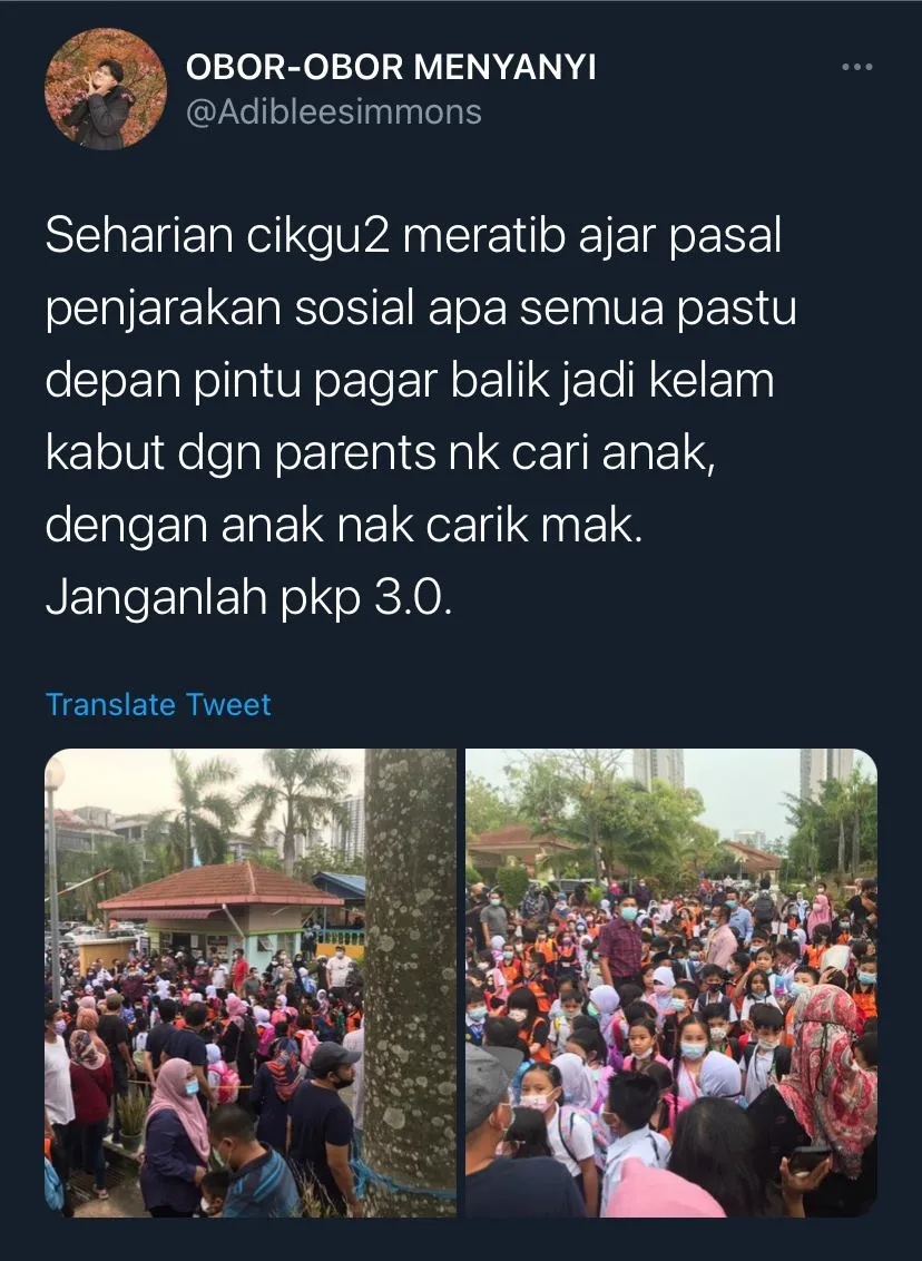“Educators have been teaching about social distancing the whole day. However, the situation was chaotic at the front school gate, with parents looking for their children, and vice versa. Hopefully there will be no MCO (movement control order) 3.0,” the netizen commented.
