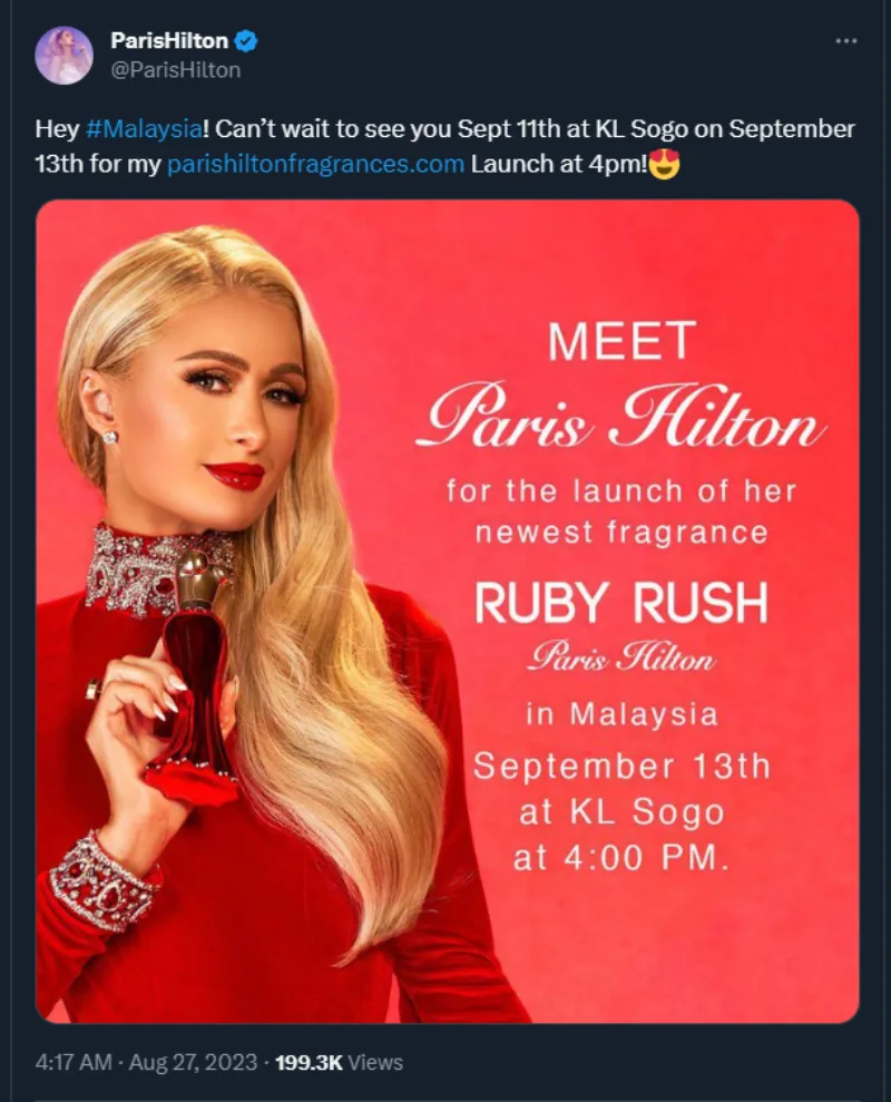Yesterday (Sunday, 27th August), American socialite Paris Hilton posted an exciting announcement for her Malaysian fans on her Twitter. The DJ said that she’ll be making her way to our shores next month in September to celebrate the launch of her new Ruby Rush perfume from her Paris Hilton Fragrances collection!