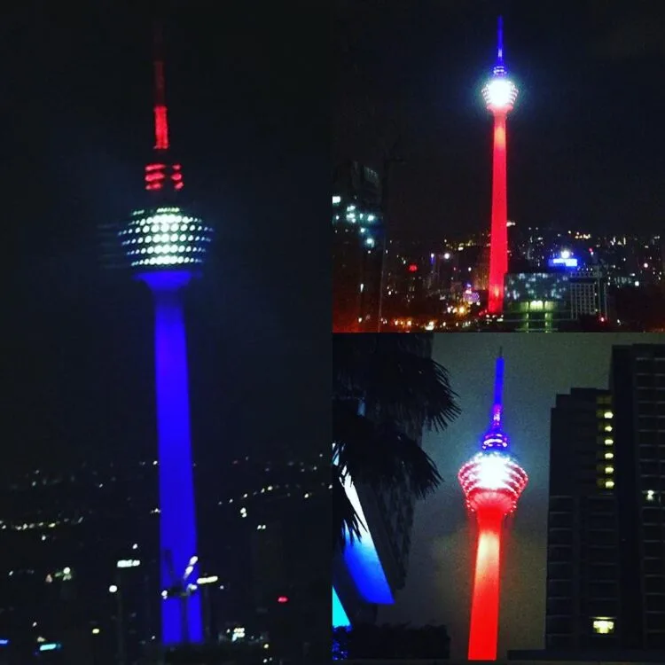 Yesterday, the Menara Kuala Lumpur aka KL Tower lit up in a display of blue, white, and red lights to symbolise the French flag. The very touching display of support was seen for one minute every hour, from 12 midnight till 7am.