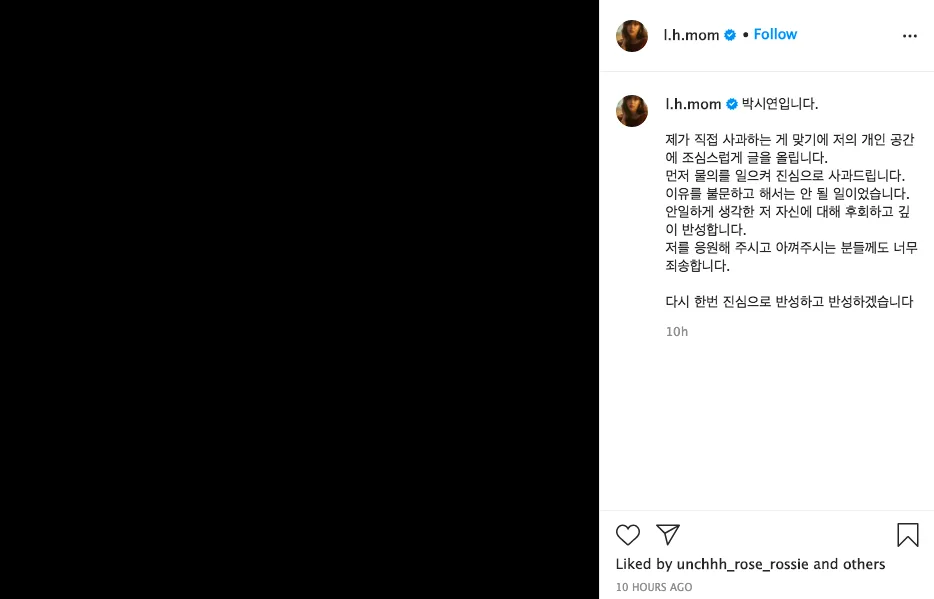 “This is Park Si Yeon. As I should personally apologise, I’m cautiously uploading a post on my personal account. First, I sincerely apologise for evoking criticism. Regardless of the reason, it was something that should not have occurred. I thought about it lightly and I am regretting and deeply reflecting on myself. I am so sorry to the people who support and cherish me as well. Once again, I will sincerely reflect on my action.”