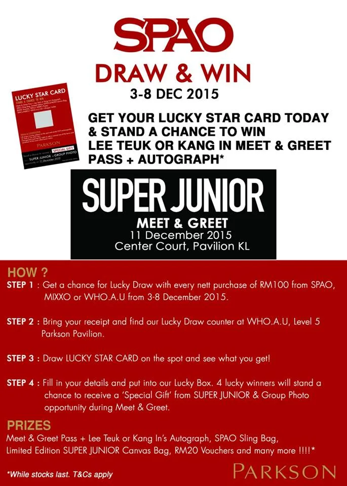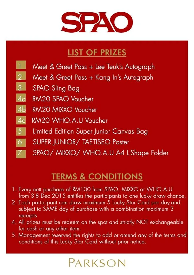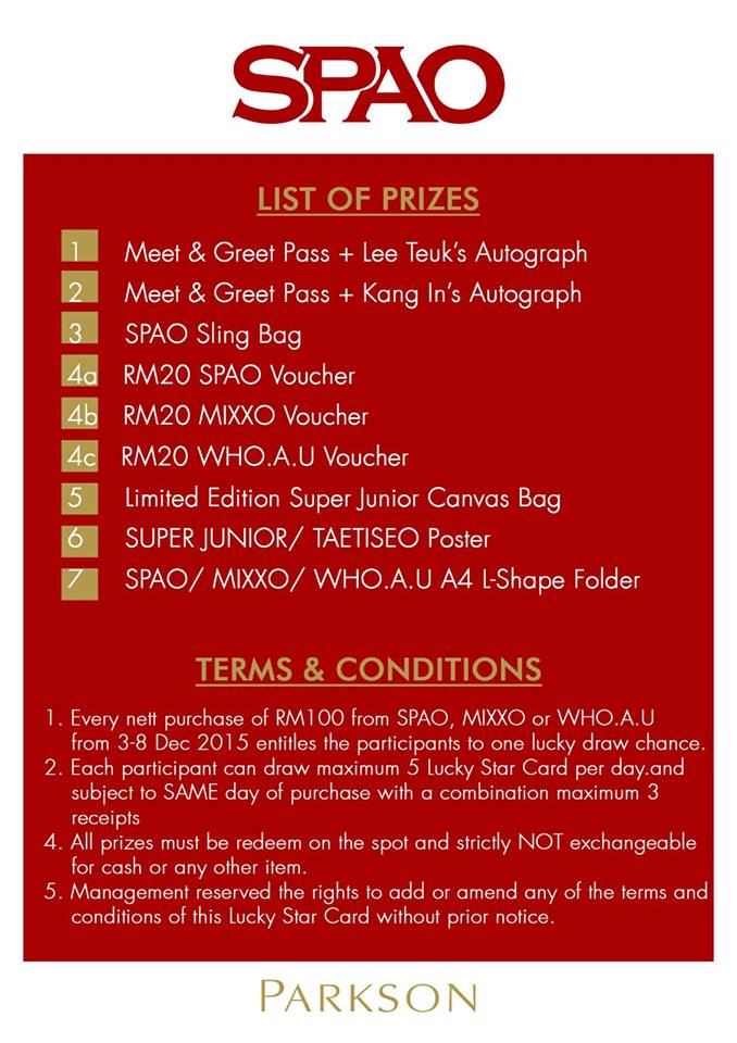 In addition to the announcement, SPAO Malaysia revealed on its Facebook page that a total of 180 meet and greet passes will be given away to shoppers through a lucky draw contest from 3rd to 8th December 2015.