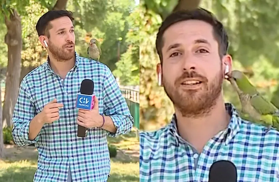 Recently, a male reporter in Chile was speaking to the audience about the rising crime rate in the area he was in when suddenly, a little parrot perched on his shoulder, much to his surprise. Being the professional he is, the reporter, Nicolas Krumm continued reporting while also trying not to scare the bird too much.