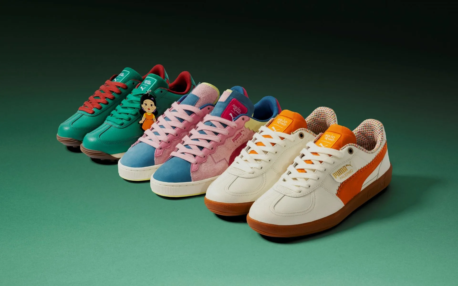 The silhouette’s signature Palermo tab conceals a hidden Squid Game easter egg underneath, while circus-inspired accents bring even more game-inspired detail to the collaborative sneaker. An accompanying t-Shirt depicts the sinister mingle game via a rear graphic print and co-branded PUMA x Squid Game label.
