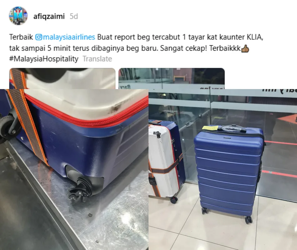 Recently, a user on Threads by the name of Afiq Zaimi shared his experience of flying with Malaysia Airlines. Although he did not specify the details of the trip, he revealed that his luggage had unfortunately lost a wheel by the time he collected it at his destination. Thankfully, after lodging a complaint, the airline promptly replaced his luggage with a new one.