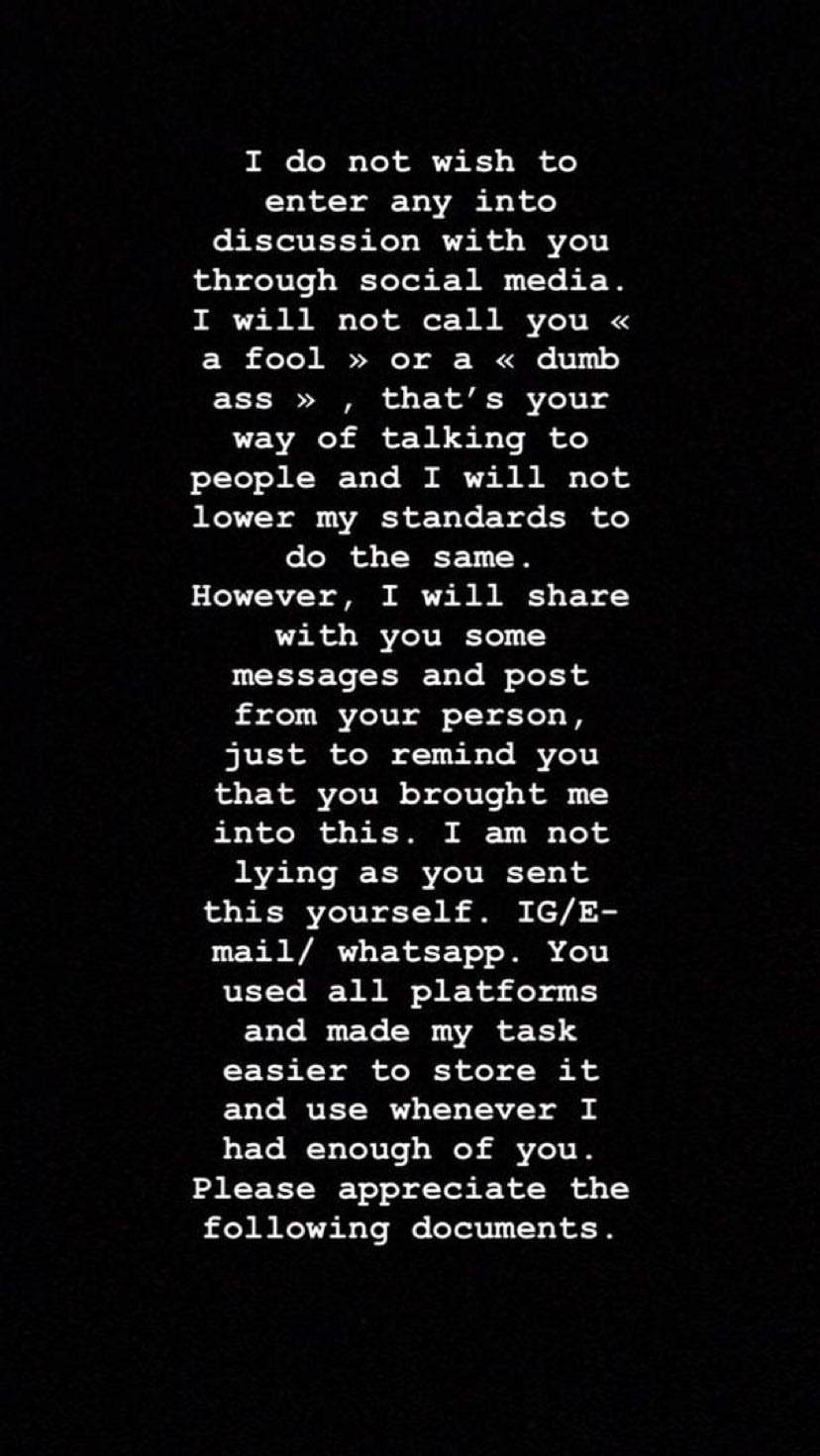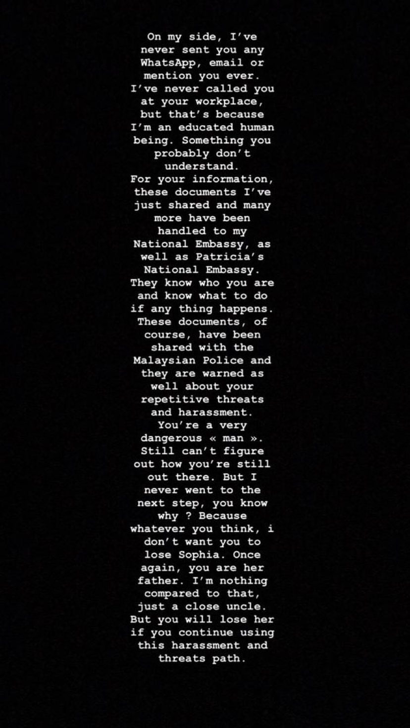“I do not wish to enter into any discussion with you through social media,” wrote Matt. The screenshot of his message was re-shared on Patricia’s Instagram stories. A couple of previous Whatsapp messages and email exchange was also uploaded online for everyone to see.