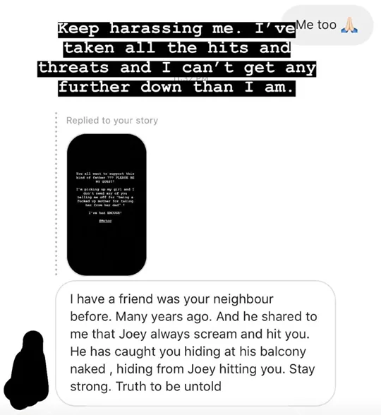 An Instagram user (whose identity has been blurred) also confirmed that a friend witnessed Joey’s physical abuse in person. “Many years ago… (Patricia was caught) hiding at his balcony naked, hiding from Joey’s hitting,” the netizen wrote. Patricia responded by saying, “I’ve taken all the hits and threats and I can’t get any further down than I am“.