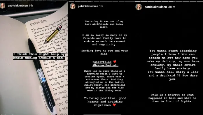 In case you’re wondering, how is Sazzy Falak connected to Sophia’s alleged drowning episode? Joey posted a message on his Instagram story yesterday, asking, “Sassy Falak? You came to our villa after a near drowning incident, brought your kids and few bottles of alcohol and got drunk with Patricia. You saw what? You saw me walk out of the villa upset that all this was happening.”