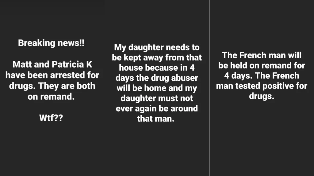 In his IG Story, the local DJ wrote, “My daughter needs to be kept away from that house because in 4 days, the drug abuser will be home and my daughter must not ever again be around that man”. As aforementioned, Matt is believed to be remanded for 4 days, until 23rd March.