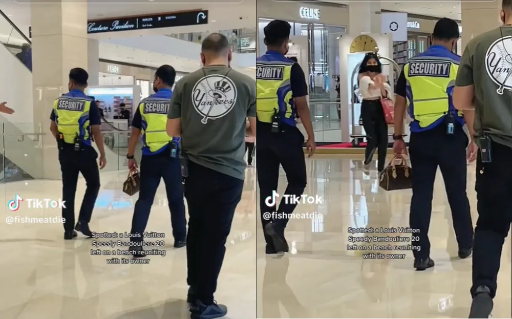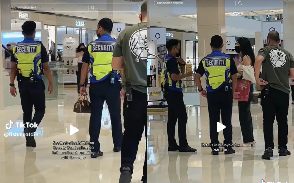 The video showed two security guards walking around in Pavilion KL. Notably enough, one of the security guards was holding a Louis Vuitton handbag. As the two continued walking, a woman, looking relieved, ran up to them and took the handbag, apparently claiming that it belonged to her. “Spotted: a Louis Vuitton Speedy Bandouliere 20 left on a bench reuniting with its owner,” a caption in the video read. “Retails in Malaysia for RM8,900.”
