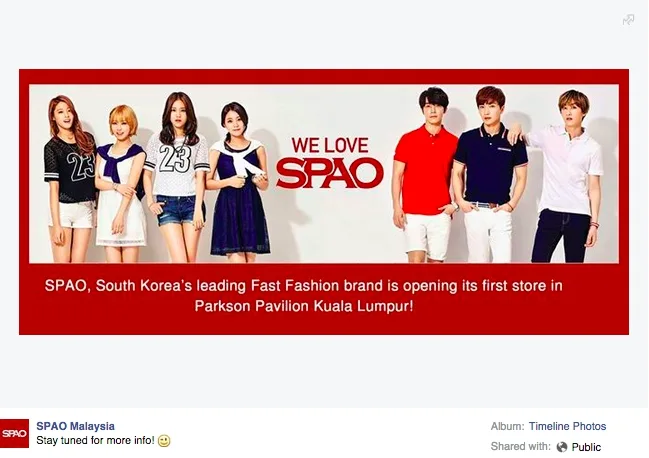 SPAO is the first original S.P.A (specialty store retailers of private label apparel) label launched by Korean fashion retailer E-Land.