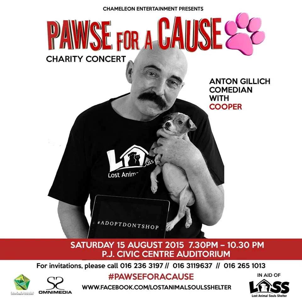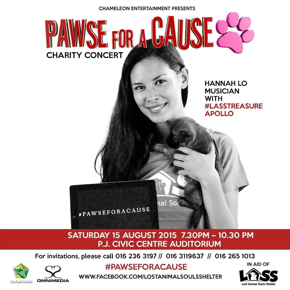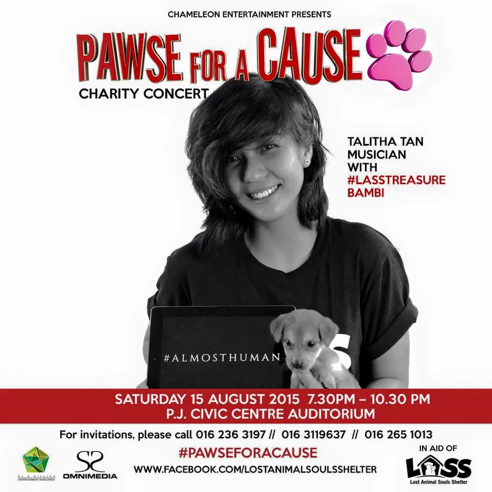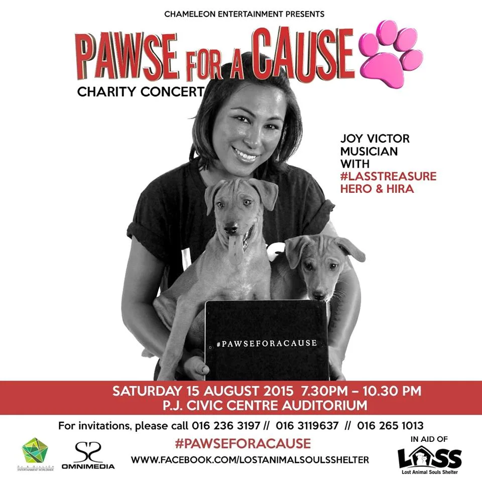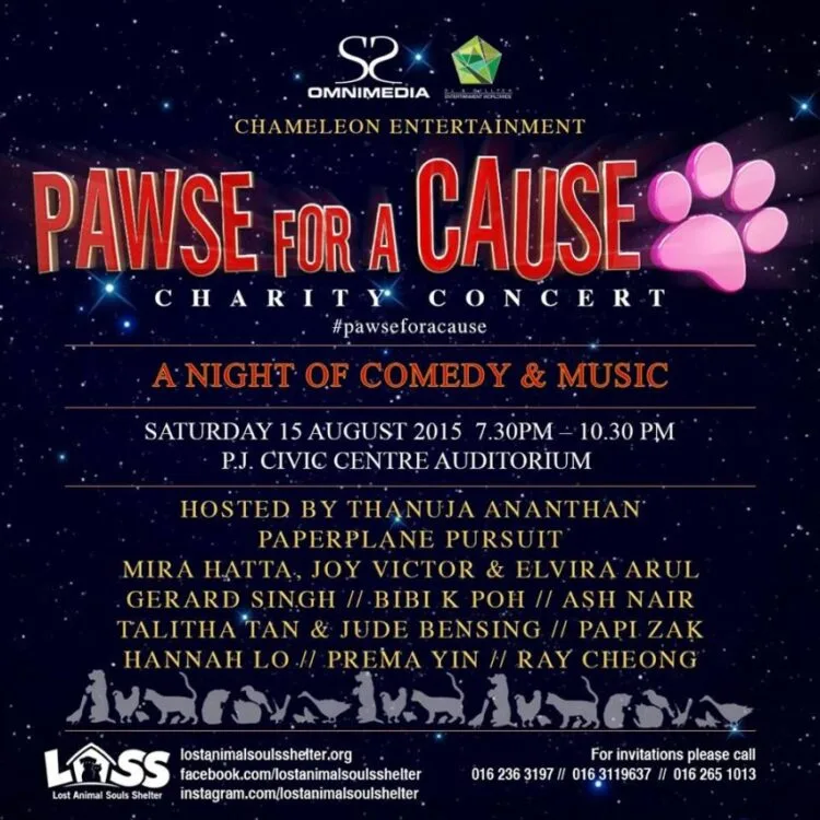 Pawse For A Cause: A Charity Concert in aid of Lost Animal Souls Shelter is organised by Chameleon Entertainment in partnership with Seema Subash OmniMedia and DJ & Gillich Entertainment Worldwide. Slated to happen on Saturday (August 15th), the concert will include musical luminaries Gerrard Singh, Paperplane Pursuit, Prema Yin, Ash Nair, Hannah Lo, Elvira Arul, Joy Victor, Mira Hatta, Ray Cheong, Talitha Tan (ft. Jude Bensing) as well as comedians Bibi K. Poh, Papi Zak and Australian laugh-guru, Jonathan Atherton. Hosting the charity concert is 2009 Miss World Malaysia and animal rights advocate, Thanuja Ananthan.