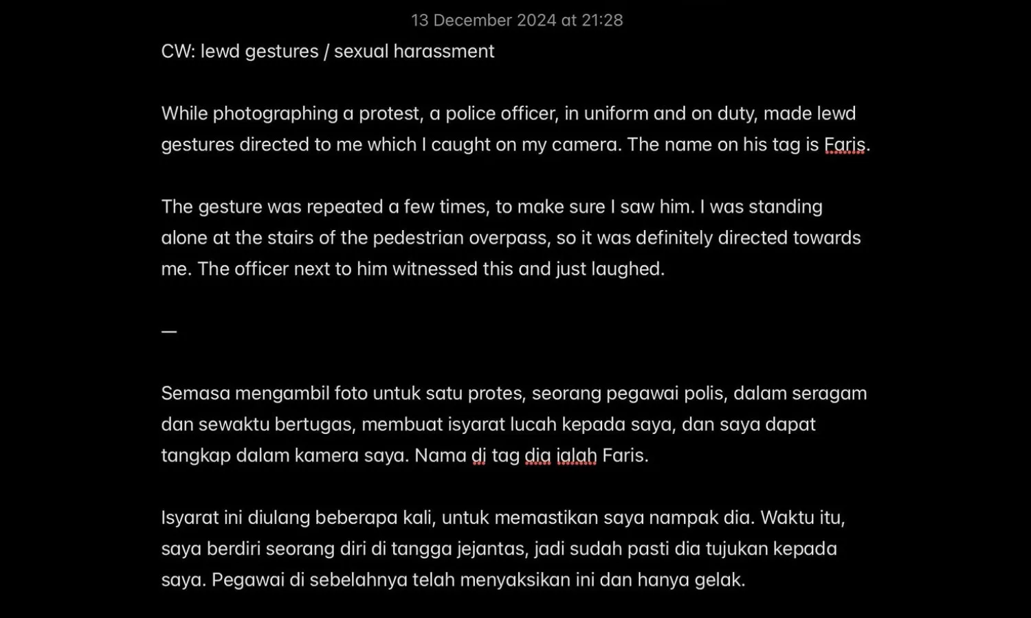 While standing alone on a pedestrian bridge photographing an ongoing protest, Intan caught Lance Corporal Muhammad Faris from Wangsa Maju District Police Headquarters (IPD Wangsa Maju) making sexual gestures with his hands and mouth multiple times. She assumed it was directed at her, as nobody else was around. “I was there to document a protest to save human lives and preserve human rights, and this police officer had the time and idea to treat me like a sexual object,” said the victim.