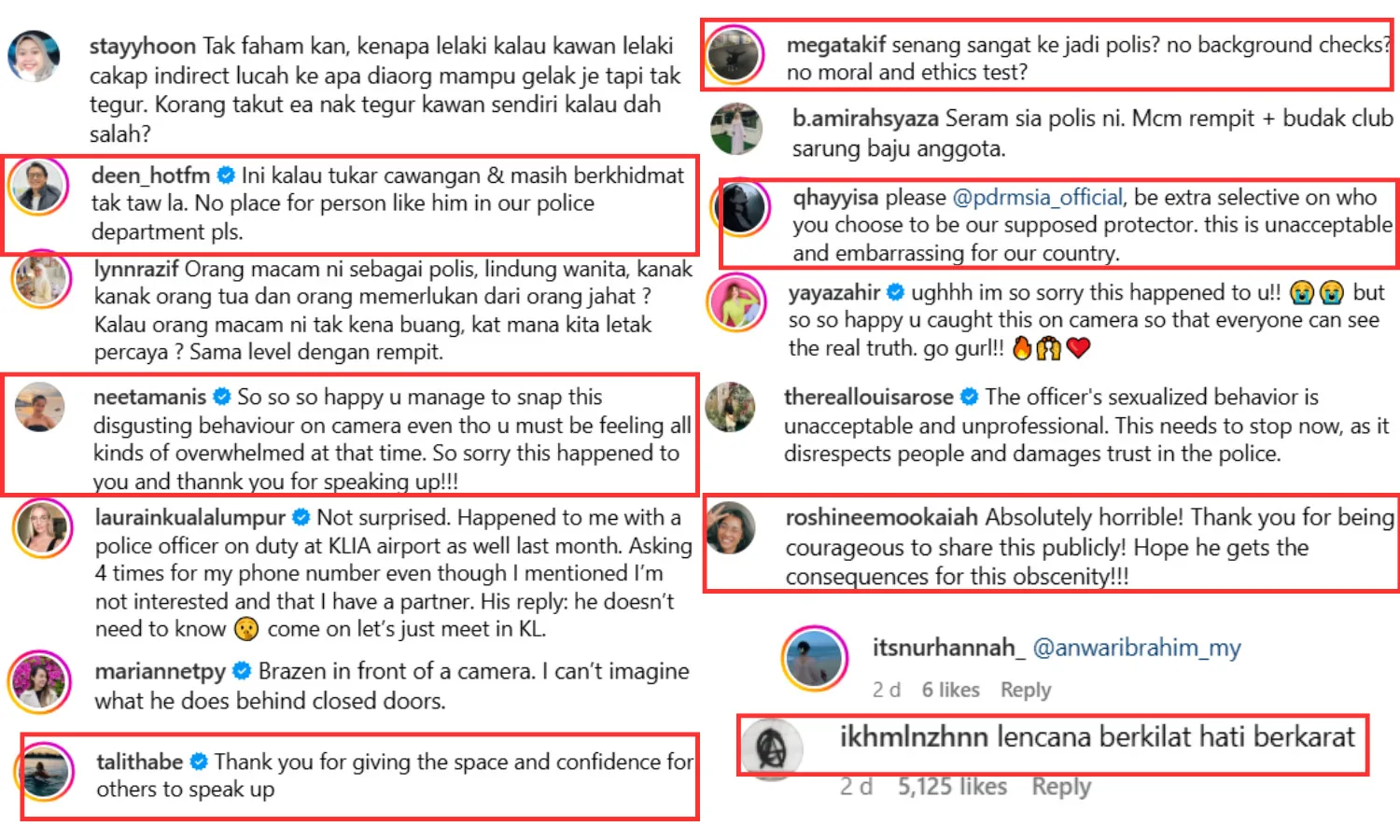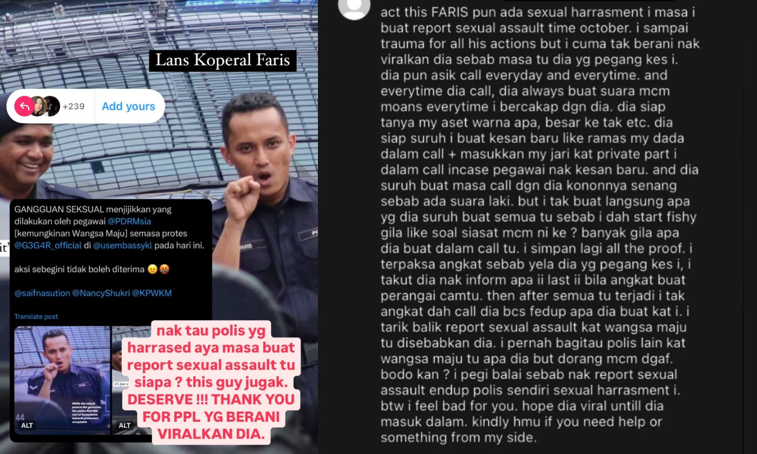 The officer’s offensive actions infuriated netizens, who blasted the PDRM for giving someone like him a place in their establishment. Another user, @/yyaamzh, came forward in Intan’s comment section to talk about the personal experience she faced from the same officer. According to the user, Yaya, she once lodged a sexual harassment report, which Faris led, but he abused his power and ended up harassing her through late-night phone calls.