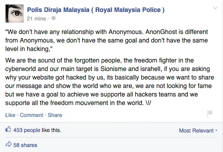 The post was followed with another update that simply reads “#Anonghost was here.” According to The Star Online, AnonGHost is a group of pro-Palestinian hackers who have, among other things, defaced a United Nations (UN) website. However, they denied links to the infamous Internet group Anonymous, clarifying that they did not share the same goals or the latter group’s technical prowess.