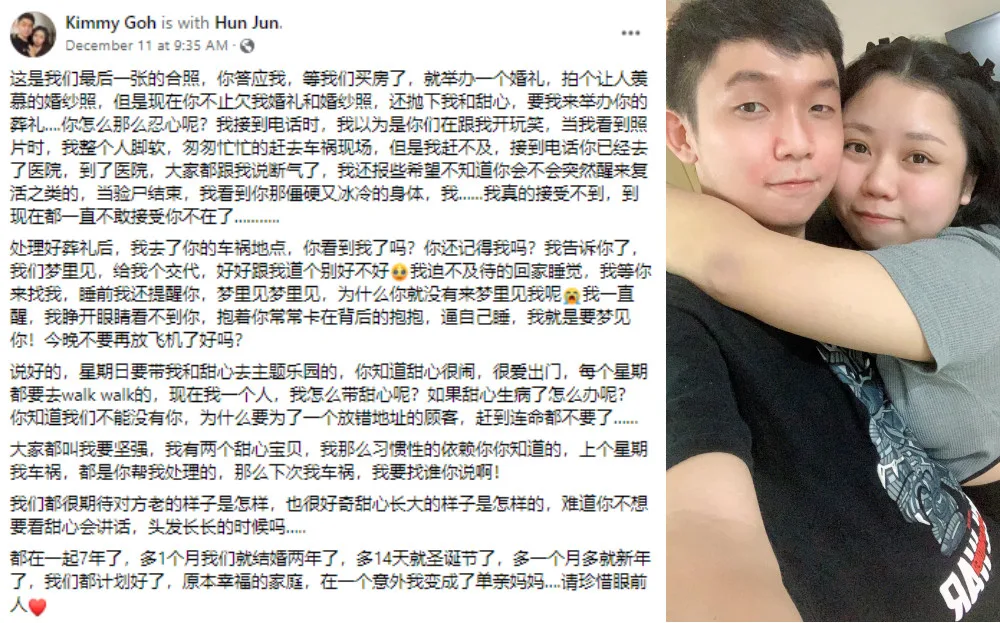 Hun Jun, a delivery food rider, was involved in an accident in Penang when he was rushing to deliver food to the correct location after a customer gave the wrong one. One day before his funeral, his wife, Kimmy took to her socials to grieve her loss and share her sorrow. Her post brought many to tears as netizens left their condolences.