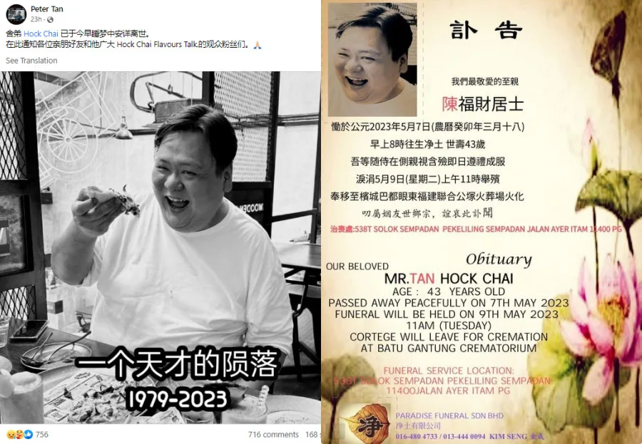 Unfortunately, just yesterday (7th May), it was revealed that Tan Hock Chai had passed away in his sleep. The food blogger was 43 years old when he passed. Since then, family, friends and fans have been mourning his passing.