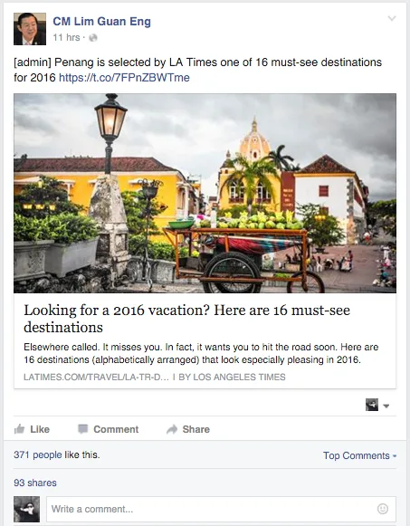 The post was then shared by Penang Chief Minister Lim Guan Eng on his Facebook page:
