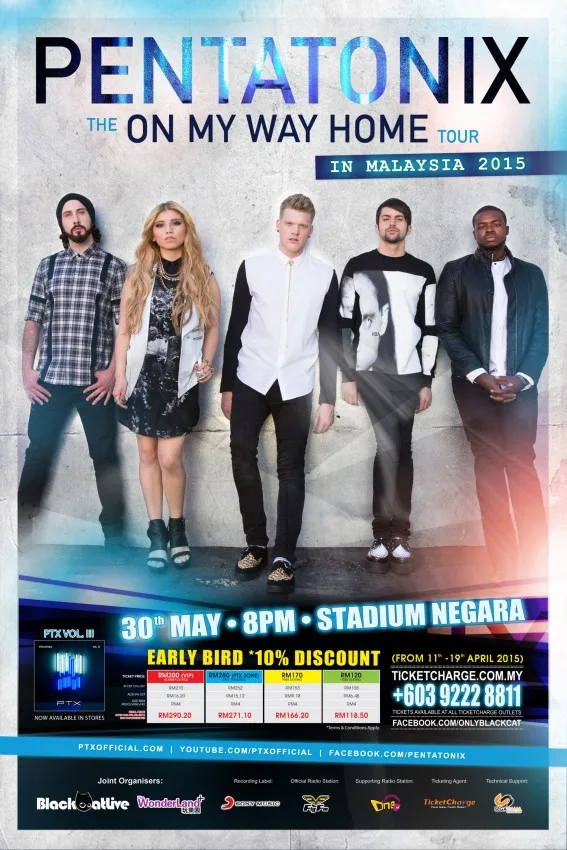 Currently on their “The On My Way Home” Tour, Pentatonix will be making their way to Malaysia this May. Details for Pentatonix “The On My Way Home” Tour in Malaysia are as follows: