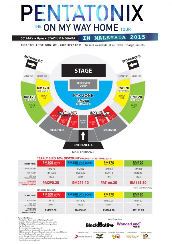 Ticketing details: RM300 (VIP – numbered seats), RM280 (PTX zone – free standing), RM170 (free seating) and RM120 (free seating). All ticket prices exclude 6% GST and RM4 processing fees.