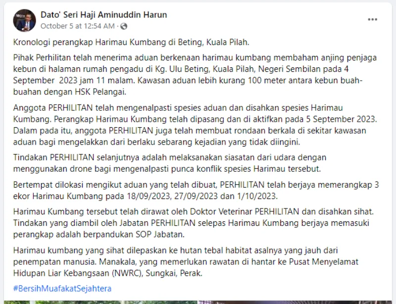 Recently, Dato’ Seri Haji Aminuddin Harun posted a chronology of how THE PERHILITAN team captured panthers that were said to be terrorising the neighbourhood of Kampung Ulu Beting, Kuala Pilah, Negeri Sembilan since early September. In the Facebook post, the politician shared that PERHILITAN took immediate action after receiving a complaint from a villager (whose dog was eaten by one of the large felines).