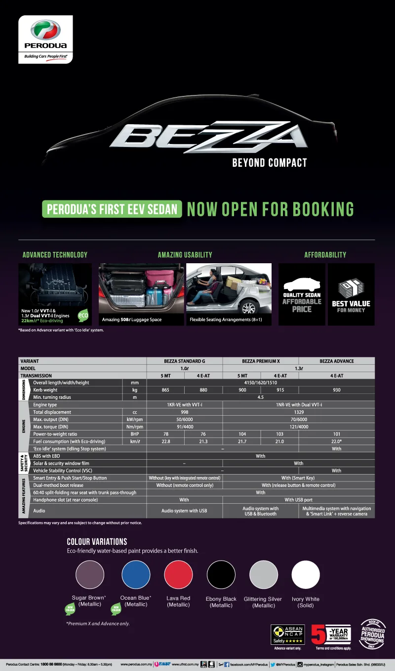 As seen in the flyer above, the sedan comes in 5 variants – 1.0L manual and automatic transmissions, 1.3L “Premium X” manual and automatic transmission and the 1.3L “Advanced Version” automatic. The Perodua Bezza is available in 6 colours – Sugar Brown and Ocean Blue (for 1.3L variants) as well as Lava Red, Ebony Black, Glittering Silver, and Solid Ivory White.