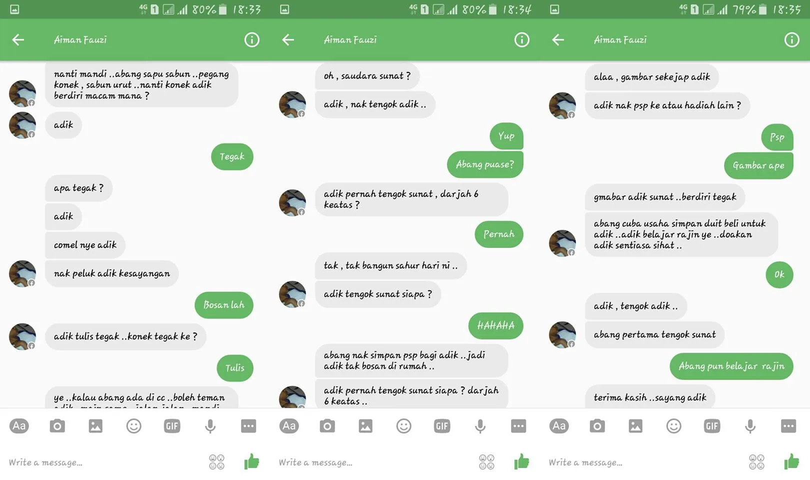 From the screen captures, we can see Aiman Fauzi, who has since closed his Facebook account, talking to her son about his “konek” (male private part). Lines such as “When you shower, I will hold your ‘konek’ and rub soap all over your body. What if it stands?”; “Have adik (little brother) seen ‘sunat’ (circumcision) on boys Standard 6 and above?”; and “Adik wrote ‘tegak’ (erection), is your ‘konek tegak’?” suggests that the suspect did indeed verbally sexual harass the 10-year-old boy.
