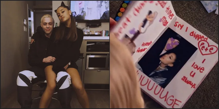 In the video, when Ariana is flipping her own “Mean Girls” inspired Burn Book where she mentions 3 of her former flames including Ricky Alvarez, Big Sean, and, of course, Pete. On Pete’s page, Ariana wrote “I love u always”, “Sry I dipped”, as well as “HUUUUGE.”
