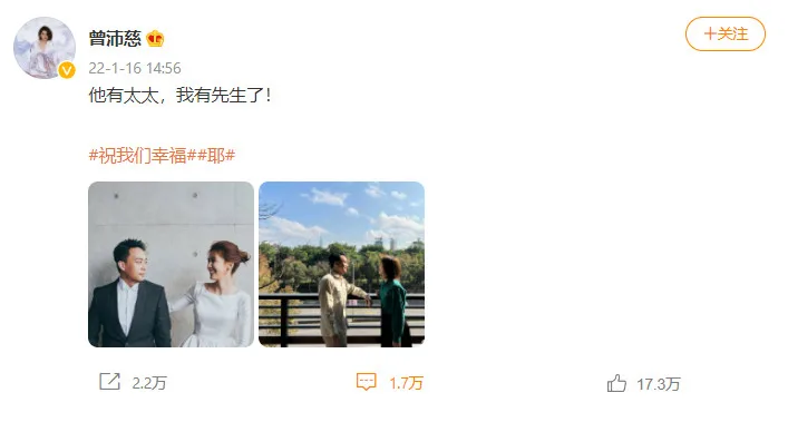 The artist kept her announcement simple and to the point. “He has a wife, I have a husband!” she wrote happily. She also asked fans and friends to bless them and included two photos of the couple looking lovingly at each other.